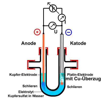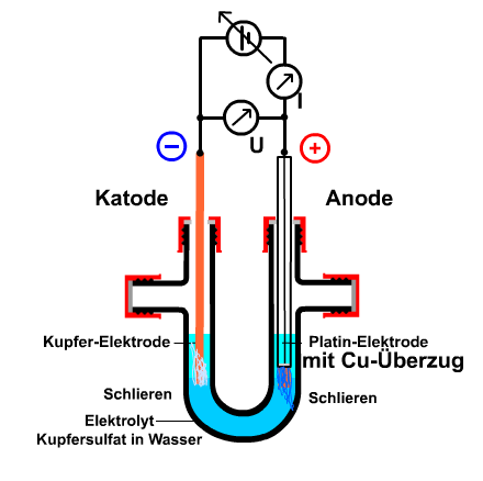 Bei der Elektrolyse von Kupfersulfat-Lösung geht an der Anode elementares Kupfer unter Bildung von Kupfer-Kationen (positiv geladenen Ionen) in Lösung. Die Ionen wandern zur Katode und werden dort wieder neutralisiert und als elementares Kupfer abgeschieden.