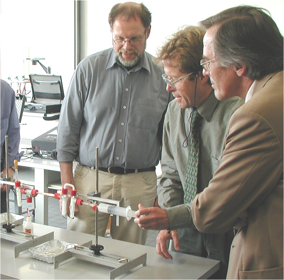 Bild 1: Die Darstellung von Natriumchlorid aus den Elementen mit der Halbmikrotechnik in geschlossener Apparatur. Bild 2: Natriumchlorid-Synthese aus den Elementen mit Entsorgung Bild 3: Natriumchlorid-Synthese aus den Elementen mit Entsorgung Bild 4: Natriumchlorid-Synthese aus den Elementen mit Auffangen des Restgases Bild 5: Reaktionsrohr (Quarzglas) + Kolbenprober (Sog) Bild 6: Reaktionsrohr (Quarzglas) + Kolbenprober (Druck) Bild 7: Quantitative Gasbestimmung bei der Reaktion eines Feststoffes mit einer Flüssigkeit Bild 8: Reaktionsrohr (Quarzglas,C ) + 2 Kolbenprober (A, E) + Tauchung (D) Bild 9: Teilapparatur A-H: Quantitative Bestimmung der Bildung von Kohlenstiffmonooxid Bild 10: Foto einer Natriumchlorid-Synthese anläßlich einer Lehrerfortbildungsveranstaltung an der Westfälischen-Wilhelms-Universität Münster , Institut der Didaktik der Chemie. (von rechts: Prof. Dr. D. Barke; Prof. Dr. G. Harsch; Dr. K.-G. Häusler)