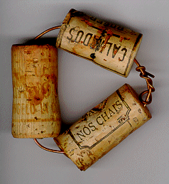 Dadurch daß man drei Korken benutzt, läßt sich der Eigenbau-Korkring sicher abstellen und hält einen Rundkolben immer ohne zu wackeln. Man entfernt aus drei Weinflaschen die Korken und entsorgt den Inhalt der Flaschen sachgerecht und sicher! Anschließend bohrt man die Korken in Längsrichtung mit einem feinen Korkbohrer auf und fädelt sie gemeinsam auf einen starken Kupferdraht. Die Enden werden miteinander verdrillt. |