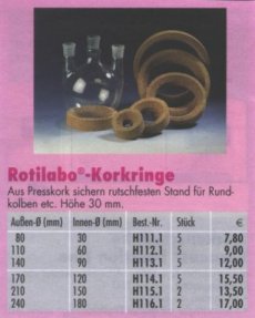 Korkringe zum Abstellen von Rundkolben sind nicht gerade billig. Man benötigt sie jedoch in mehreren Größen und Anzahl, um zum Beispiel bei Wechseln der Kolben bei fraktionierten Destillationen abstellen zu können. (Preisaufstellung der Firma Roth, Mai 1998) |