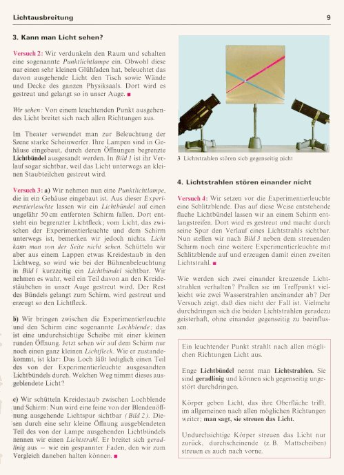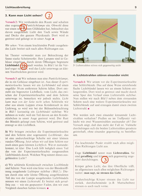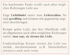 dem Gebiet Physik (Optik) dargestellt. Abbildung der Seite in hoher Auflösung (95 kB) im neuen Fenster Auf den ersten Blick sieht man zwei spaltigen Text, Abbildung und Hervorhebungen im Text. Der zweispaltige Text wird gewählt, um dem Auge bei längerem Lesen weite Wege zu ersparen. Man liest mit weniger Anstrengung. Der Text ist "überschaubar". "Mit einem Blick" auf die Abbildungen kann man das Thema der Seite erfassen. Die Hervorhebungen (kursiv, fett, rot) sollen auf Wichtiges hinweisen, sie sollen einem "ins Auge springen". |